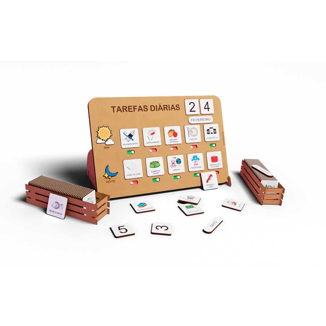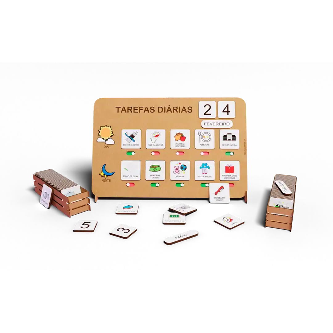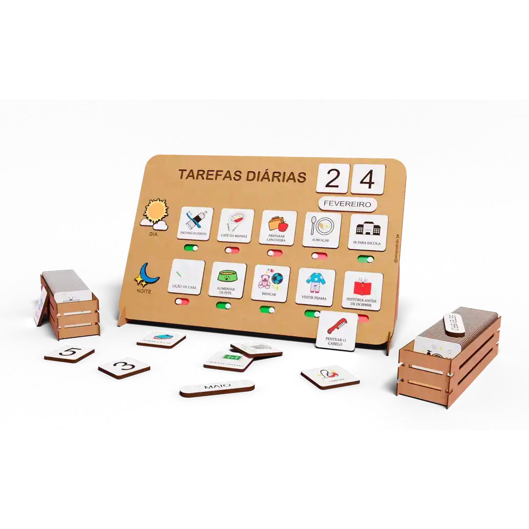 Quadro Tarefas Diárias, suporte, 2 cestas, 31 cards pré-definidos + 3 cards em branco para personalizar como desejar, meses do ano e dias do mês. Quadro tem botão interativo para que a criança possa sinalizar o que já realizou.